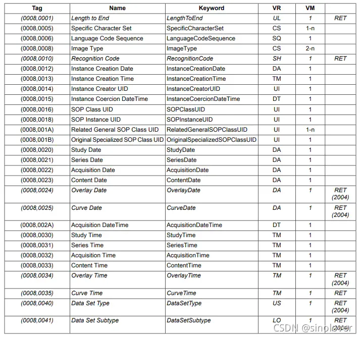 | Group | Element | Tag Description | 中文解释 | VR | VM | |