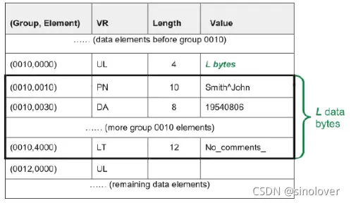 - Tag:属性标识,为两个十六进制的数的组合(0x0002, 0x0003),分别是Group和Element