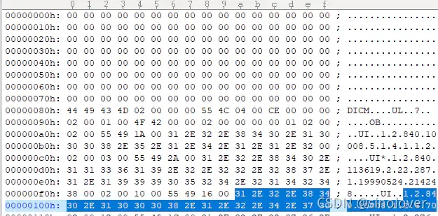 - 前128个字节为00H,然后读取4个字节,值为“DICM”,确认是DICOM格式文件