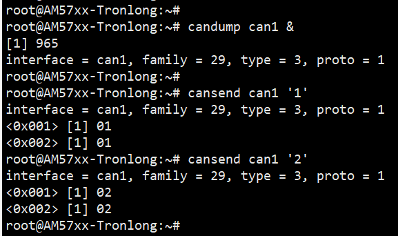 指定 CAN 接口即可开始接收。这里与 cansend 程序的结合使用,板卡上的 CAN0 和 CAN1 使用连接线进行了对接。