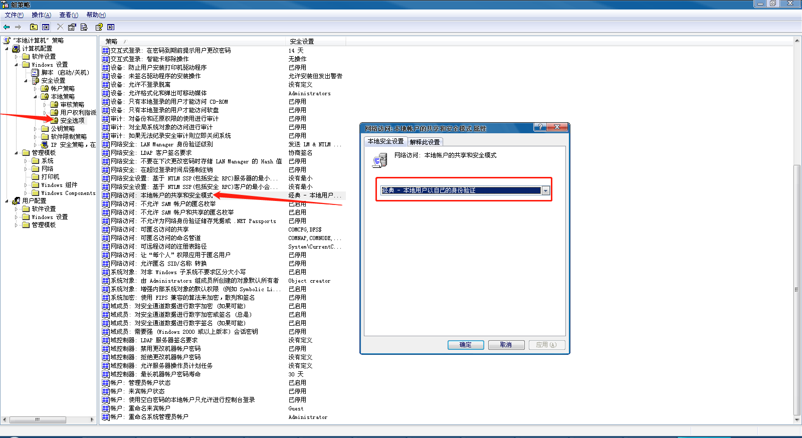 运行-secpol.msc-本地策略-安全选项-网络访问:本地账户的共享和安全模型