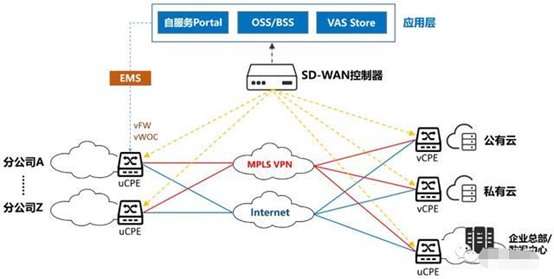 管理员可以通过应用层接口对SD-WAN控制器进行配置,也可以下发vFW(虚拟防火墙,Firewall)、vWOC(虚拟广域网优化控制器,WAN Optimization Controller)功能到CPE,实现相应的功能,无需专门购买硬件。