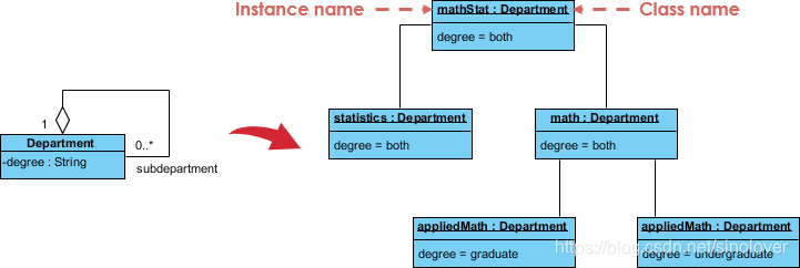 以下订单管理系统显示它们之间的关系。这个小类图表明大学部门可以包含许多其他部门,下面的对象图实例化类图,并用一个具体的例子来代替它。