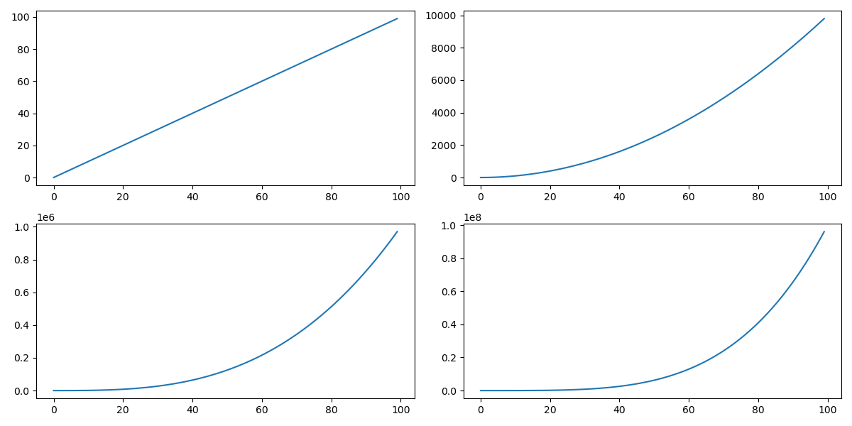 import matplotlib.pyplot as pltx = np.arange(100)plt.figure(figsize=(12, 6))plt.subplot(221) # 第 1 个子图