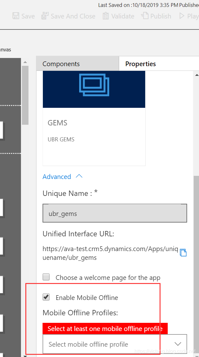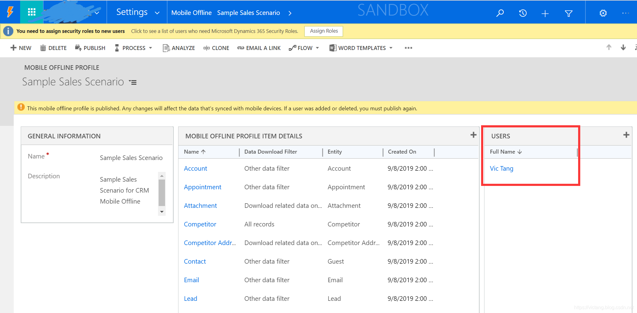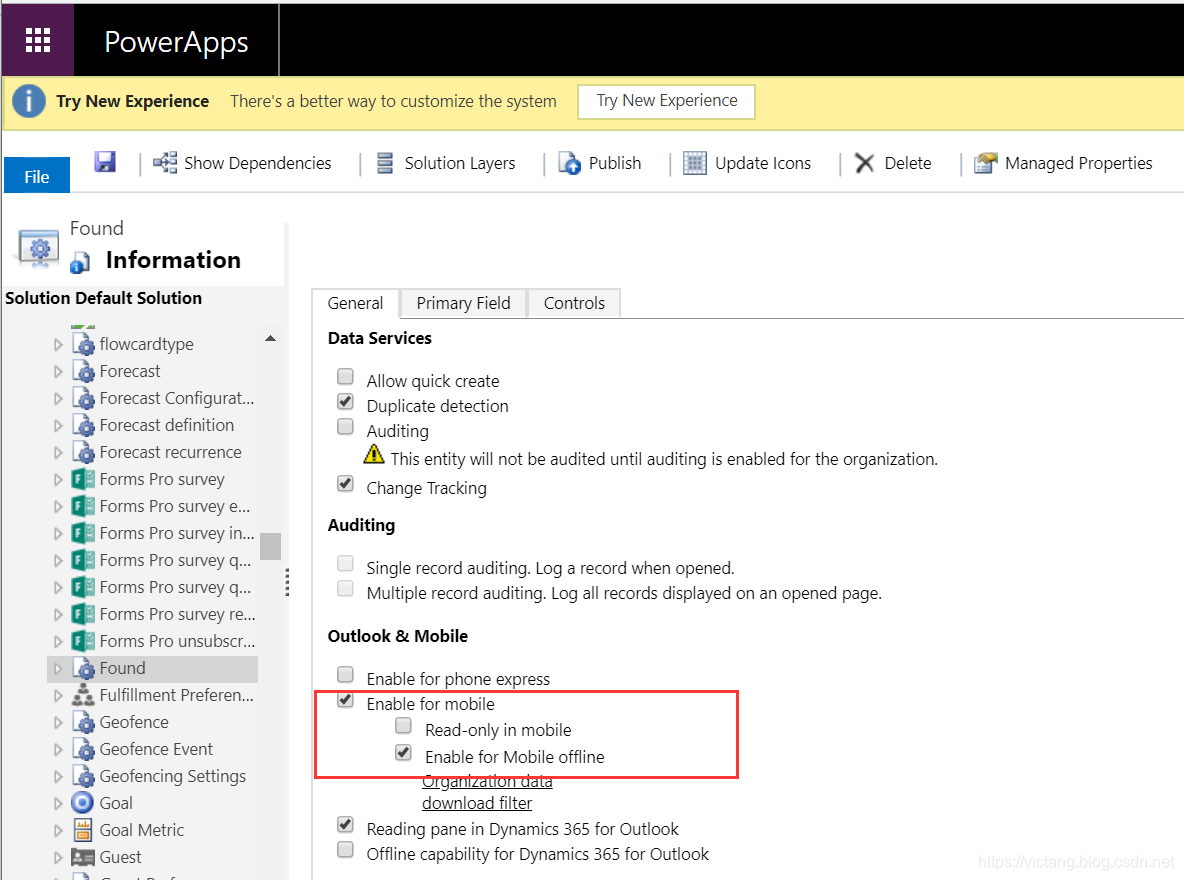 第一步,首先要确定你需要开放离线功能的实体,如下红框中的勾上后保存发布