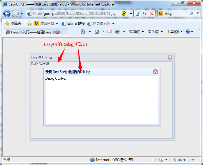1 <%@ page language="java" pageEncoding="UTF-8"%>2 <!DOCTYPE HTML>3 <html>4 <head>5 <title>EasyUI入门——创建EasyUI的Dialog</title>6 <!-- 引入JQuery -->7 <script type="text/javascript" src="${pageContext.request.contextPath}/jquery-easyui-1.4.1/jquery.min.js"></script>8 <!-- 引入EasyUI -->9 <script type="text/javascript" src="${pageContext.request.contextPath}/jquery-easyui-1.4.1/jquery.easyui.min.js"></script>