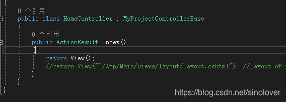 - 我们猜测主页面路由指向问题,找到HomeController控制器,看到以下代码