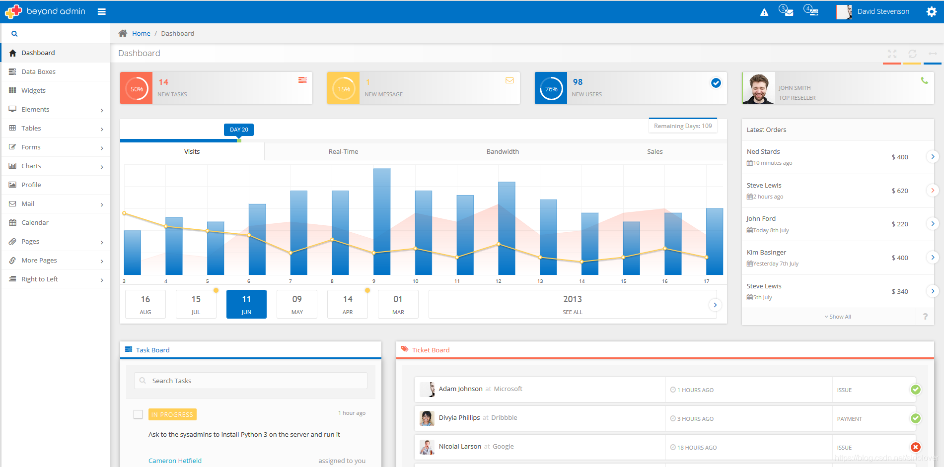- beyond admin(bootstrap ):个人比较喜欢这个范,而且提供的控件也足够使用,决定就使用它了,而且它本身也是把大部分bootstrap常见的控件融合了起来,比如:jquery.datatables、fonts等