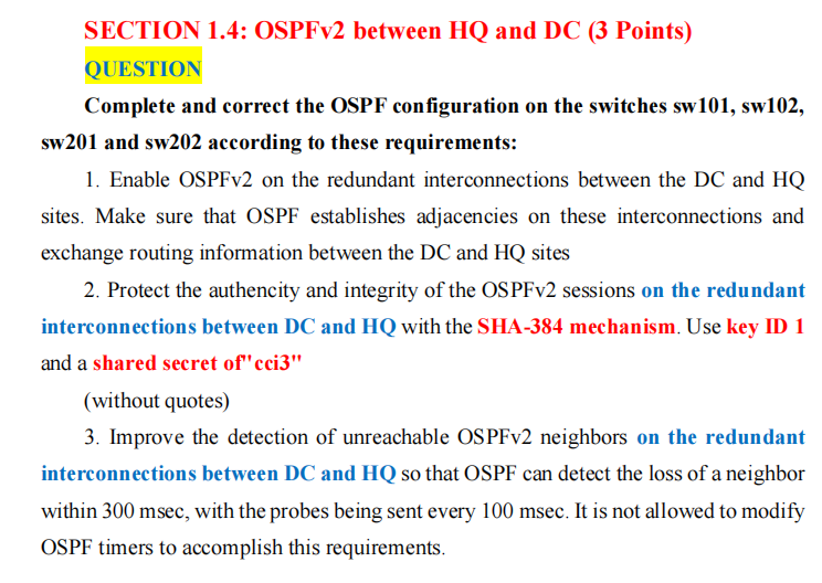CCIE-LAB-第四篇-OSPFv2+SHA384+BFD 实际中,思科只会给你5个小时去做下面的全部配置 这个是CCIE-LAB的拓扑图 问题 本次修改设备为sw101.sw102.sw201.sw202 问题描述 1:启动OSPFv2,保证邻居关系 2.保障认证和完整性,在冗余连接上. DC和HQ要保证OSPF的源数据,