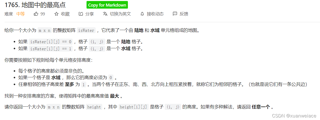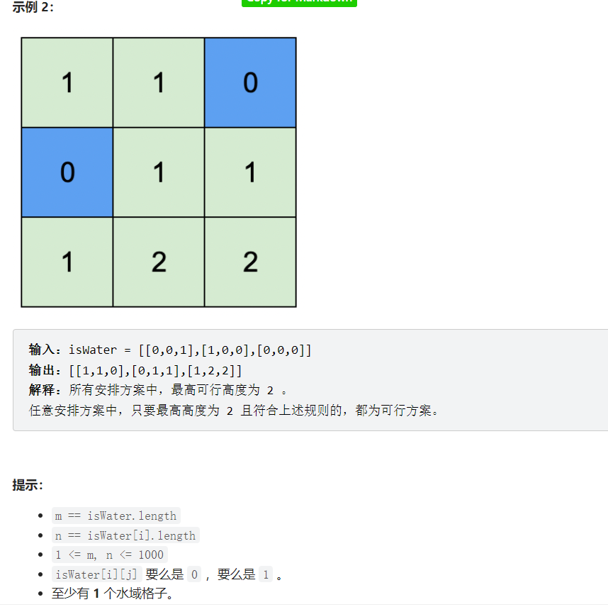 public:vector<vector<int>> highestPeak(vector<vector<int>>& isWater) {int n = isWater.size(), m = isWater[0].size();vector<vector<int>> ans(n, vector<int>(m,-1));queue<pair<int, int> > q;for(int i = 0; i<n; i++) {for(int j = 0; j<m; j++) {if(isWater[i][j] == 1) {q.push(make_pair(i,j));ans[i][j] = 0;} }}int nx[4] = {0,1,0,-1};int ny[4] = {1,0,-1,0};while(q.size()) {pair<int, int> cur = q.front();q.pop();for(int k = 0; k<4; k++) {int tx = cur.first + nx[k];int ty = cur.second + ny[k];if(tx < 0 || tx >= n || ty < 0 || ty >= m) continue;if(ans[tx][ty] != -1) continue;ans[tx][ty] = ans[cur.first][cur.second] + 1;q.push(make_pair(tx, ty));}}return ans;}