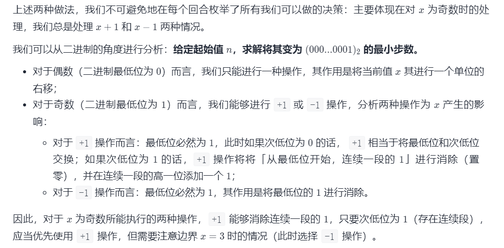 public:int integerReplacement(long long n) {int ans = 0;while (n != 1) {if (n % 2 == 0) {n >>= 1;} else {if (n != 3 && (n%4) == 3) n++;else n--;}ans++;}return ans;}