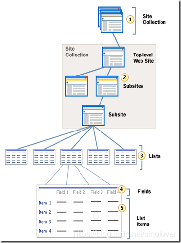 网站中一些常用对象的结构大概如下图所示(从SharePoint 2003起,这部分内容在结构上未曾发生根本性的变动):