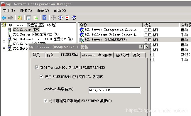 - 通过SQL Server Configuration Manager,启用数据库的FileStream特性。然后通过以下语句,设置fielstream的可访问级别: