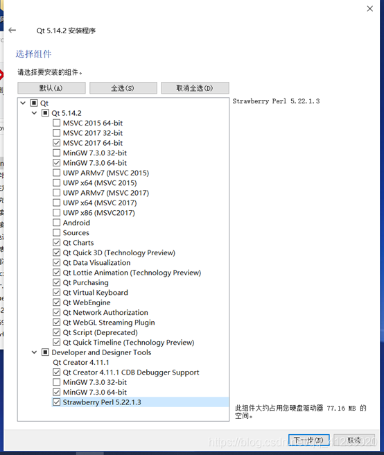 MSVC 是 VisualStudio 的安装包,本教程用不到,但是也装上了,带 android、ios、winrt 字样的一般是手机和平板操作系统的软件开发用的安装包。64位系统按照下图选: