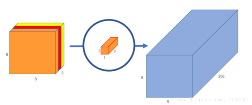 我们可以创建256个1x1x3内核,每个内核输出一个8x8x1图像,以得到形状为8x8x256的最终图像。