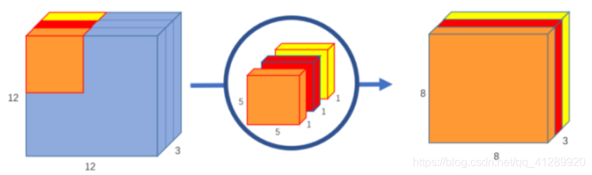 图6:深度卷积,使用3个内核将12x12x3图像转换为8x8x3图像