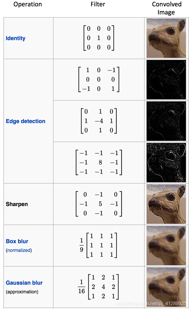 在下表中,我们可以看到上图在不同过滤器下卷积的效果。如图所示,只需在卷积运算前改变过滤器矩阵的数值就可以执行边缘检测,锐化和模糊等不同操作 [8] —— 这意味着不同的过滤器可以检测图像的不同特征,例如边缘, 曲线等。更多此类示例可在 这里 8.2.4节中找到。