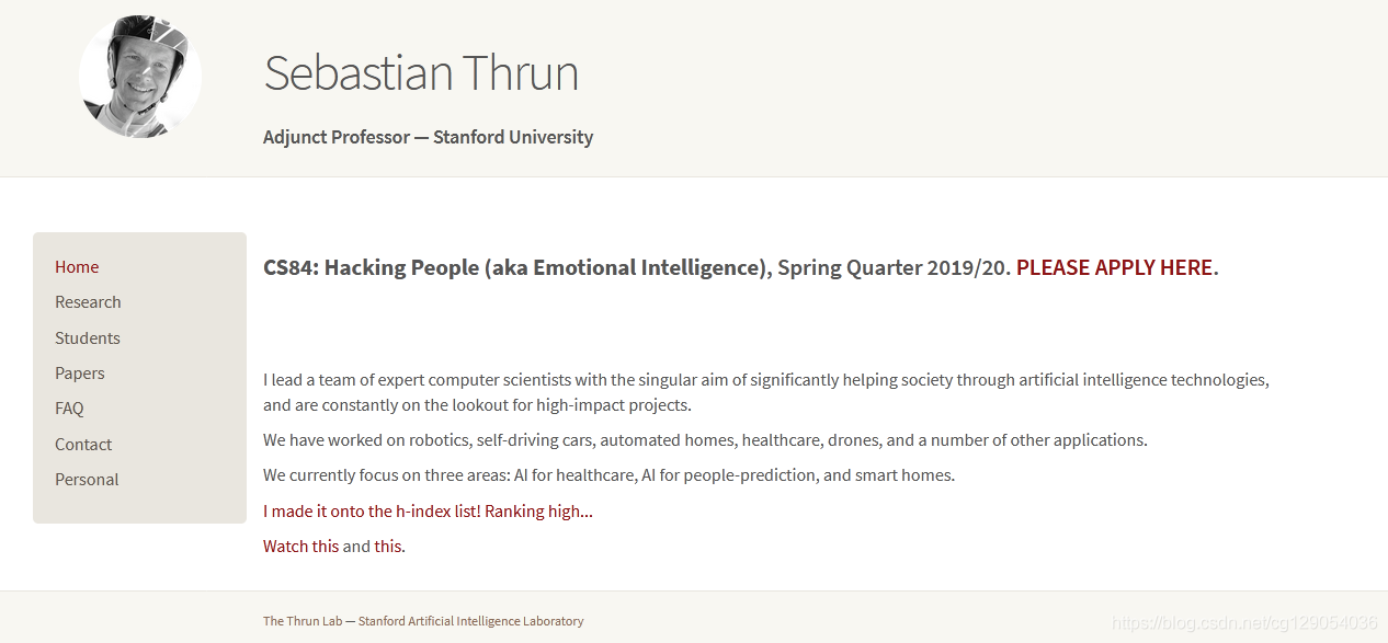关于Sebastian Thrun博士,网上资料还是比较多的,之前是谷歌无人车之父,现在是UDACITY创始人,国内有很多工程师应该都学过UDACITY的《无人驾驶工程师》课程。这里给出Thrun的个人主页,大家可以关注了解下:http://robots.stanford.edu/index.html。