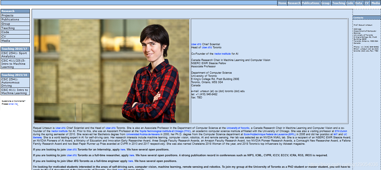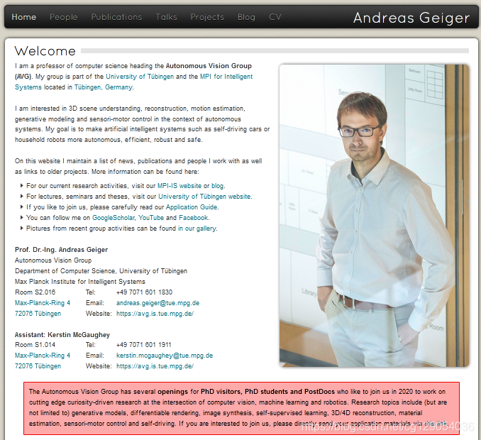 Andreas Geiger在无人驾驶领域也不用过多介绍,其本人是KITTI数据集作者之一,KITTI数据集对自动驾驶技术的发展有着里程碑的意义,有机会的也可以去读Andreas Geiger的博士,个人主页是:http://www.cvlibs.net/index.php。