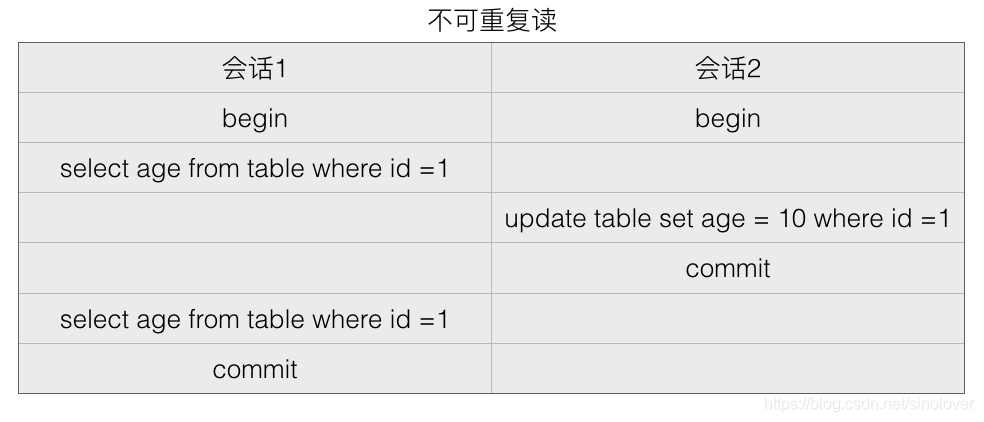 如上图开启两个会话来模拟两个线程同时去访问数据库表table中id=1的记录,假设两个会话开启前数据库中table表中id=1的记录行里面的列age值为5。会话1和2一开始都开启了显示的事务(只有执行commit命令才会提交数据的修改),会话2首先更新了table中id=1的记录行的age列的值为10(更新前值为5),在会话2执行commit提交前,会话1通过select语句查询id=1的记录行中age列的值,这时候如果存在脏读,则会话1读取到的age的值是10而不是5了,虽然会话2的更新还没有提交。那么脏读存在什么问题那?如果会话2最后提交了,那么会话1虽然在会话2还没提交就读取到了修改的值,但是也没什么影响;但是如果会话1读取到会话2没有提交的数据后,会话2执行了rollback,也就是没有把修改刷新到数据库,但是会话1已经使用了修改的数据,这就出现了错误。