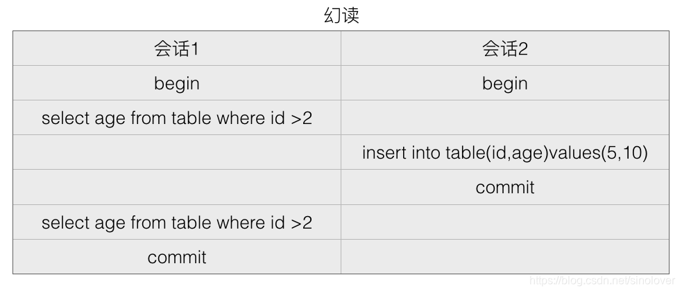 如上图假设表table里面一开始有一个id=3的记录,会话1首先开启了一个事务,然后查找id>2的记录,会发现结果只有一个记录,然后会话2开启事务插入了id=5的一个记录,然后提交。这时候会话1再次查找id>2的记录,如果存在幻读,则这时候会话1会看到两条记录。