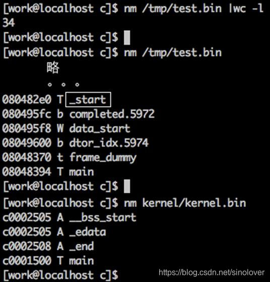 咱们继续看kernel.bin中的符号,一共就4行,尽管其中也包含了咱们不认识的符号,但毕竟少得多,我们的程序更短小精干,而且确实没有_start函数。这里添加了3个类型为A的符号,这表示它们的值是不变的。T表示是该符号是位于代码段中,更多符号的意义请参考man nm。