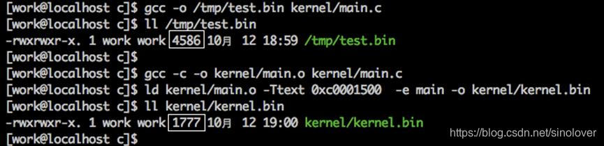 也许有同学想过,哎?我平时写的程序也没有_start啊,直接用gcc编译后就能运行,没出过问题啊。是啊,确实如您所说,由于我也没深入研究过,但咱们通过比较的方式,让您自己悟出这里面的秘密。还是用上述代码为例,gcc –o /tmp/test.bin kernel/main.c编译链接,由于未加-c参数,生成的test.bin不再是目标文件而是可执行文件。然后再用先编译成目标文件再链接成可执行文件的方式,对比这两个文件的区别。见图