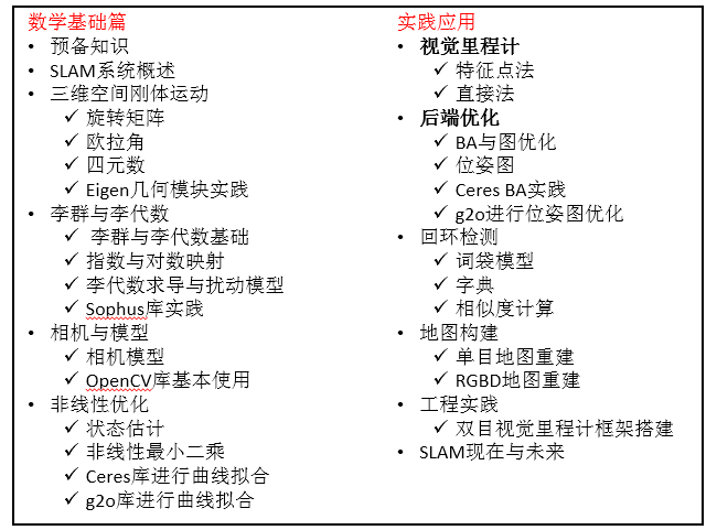 这本书内容会涉及SLAM的历史,理论,算法,现状,并把完整的SLAM系统分成几个模块:视觉里程计,后端优化,建图,以及回环检测。除了必要的数据理论外,还会用到Eigen,OpenCV,PCL,g2o,Ceres等库。