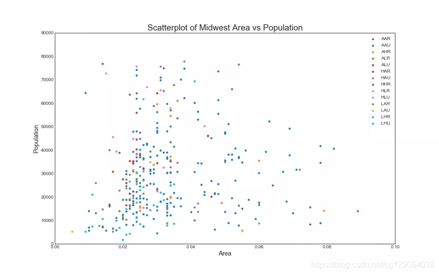 plt.figure(figsize=(16, 10), dpi= 80, facecolor='w', edgecolor='k')for i, category in enumerate(categories):plt.scatter('area', 'poptotal', data=midwest.loc[midwest.category==category, :], s=20, c=colors[i], label=str(category))# Decorations