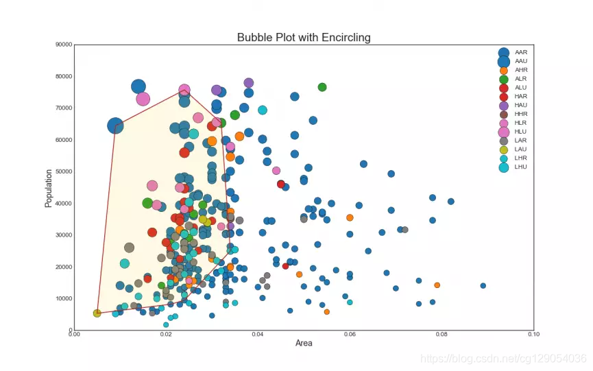 def encircle(x,y, ax=None, **kw):if not ax: ax=plt.gca()p = np.c_[x,y]hull = ConvexHull(p)poly = plt.Polygon(p[hull.vertices,:], **kw)ax.add_patch(poly)# Select data to be encircled