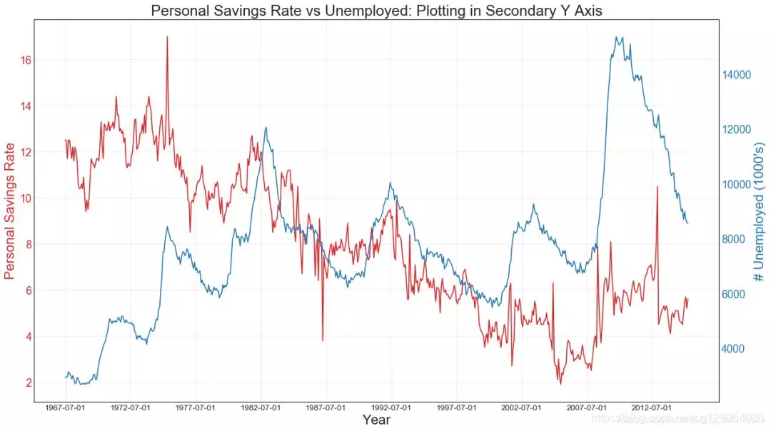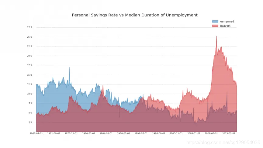 未堆积区域图用于可视化两个或更多个系列相对于彼此的进度(起伏)。在下面的图表中,您可以清楚地看到随着失业中位数持续时间的增加,个人储蓄率会下降。未堆积的区域图表很好地揭示了这种现象。