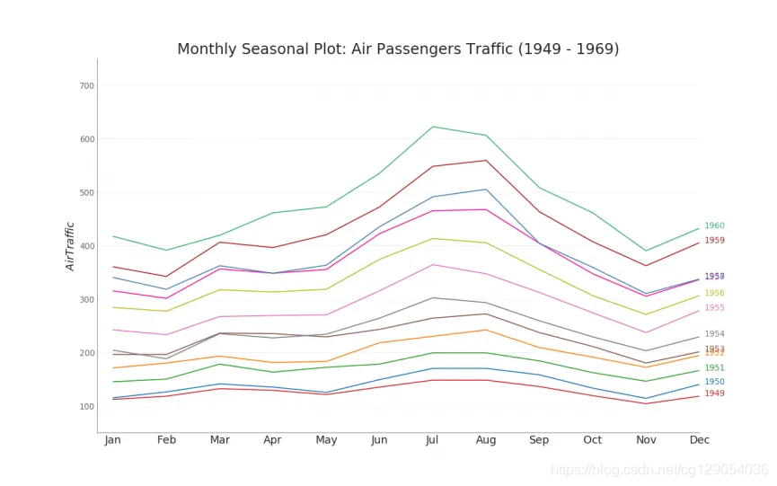 plt.figure(figsize=(16,10), dpi= 80)for i, y in enumerate(years):plt.plot('month', 'traffic', data=df.loc[df.year==y, :], color=mycolors[i], label=y)plt.text(df.loc[df.year==y, :].shape[0]-.9,df.loc[df.year==y, 'traffic'][-1:].values[0], y, fontsize=12, color=mycolors[i])# Decoration