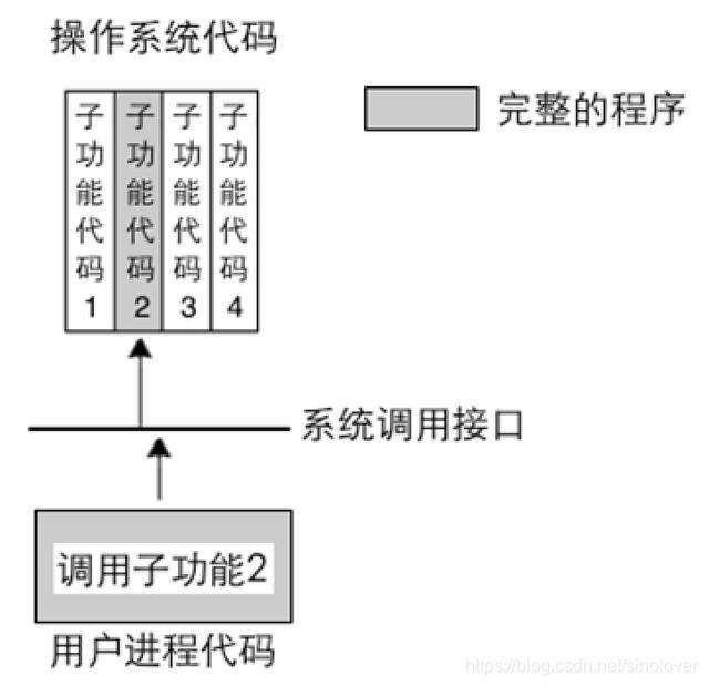要完成一件事,用户进程做的事情只能算个半成品,您可以理解成:用户的代码加上所需要的操作系统中的部分代码才算完整的程序,为什么说是操作系统中的部分代码呢?原因很简单,因为操作系统严格来说是一套功能的集合,用户进程所需要的部分可能仅仅是其中的一小小部分,并不是所有功能都会用到。用户进程能用哪些功能,是由操作系统决定的,不是用户想用什么就用什么,而是操作系统提供什么它就用什么。完整的程序概念见图: