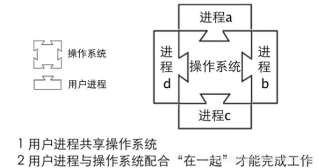 上图不仅展示了用户进程共享操作系统的逻辑依赖关系,还用插槽展示了它们的配合关系,用户进程要想完成某件工作,需要与操作系统结合在一起才行,那用户进程和操作系统它们是什么关系呢?