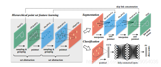 网络的每一组set abstraction layers主要包括3个部分:Sampling layer, Grouping layer and PointNet layer。