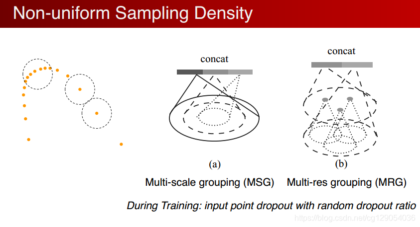 作者提到这个问题需要解决,并且提出了两个方法:Multi-scale grouping (MSG) and Multi-resolution grouping (MRG)。下面是论文当中的示意图。