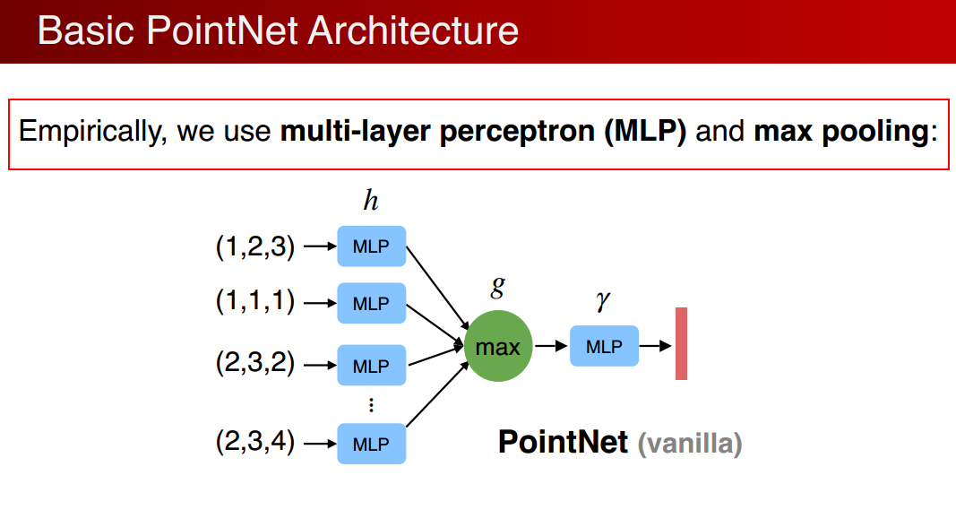 虽然是置换不变的,但是这种方式只计算了最远点的边界,损失了很多有意义的几何信息,如何解决呢?与其说直接做对称性可以先把每个点映射到高维空间,在高维空间中做对称性的操作,高维空间可以是一个冗余的,在max操作中通过冗余可以避免信息的丢失,可以保留足够的点云信息,再通过一个网络来进一步消化信息得到点云的特征。这就是函数的组合:每个点都做h低维到高维的映射,G是对称的那么整个结构就都是对称的。下图就是原始的pointnet结构。