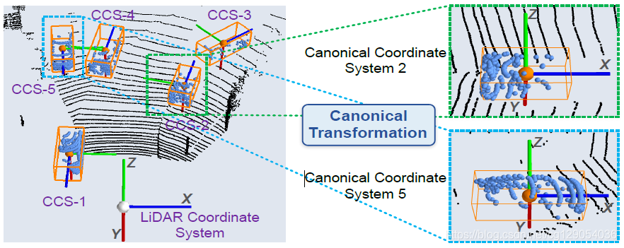 坐标转化:为了更好地获取局部信息,需要将多个候选区域中的前景点坐标(同一个坐标系)转化为局域坐标系中的规范坐标(以预测框为中心点的多个坐标系),如下图所示: