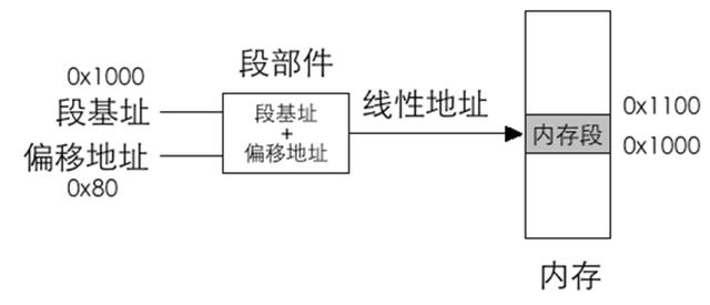 尽管在保护模式中段寄存器中的内容已经是选择子,但选择子最终就是为了要找到段基址,其内存访问的核心机制依然是“段基址:段内偏移地址”,这两个地址在相加之后才是绝对地址,也就是我们所说的线性地址,此线性地址在分段机制下被cpu认为是物理地址,直接拿来就能用,也就是说,此线性地址可以直接送上地址总线。将段基址和段内偏移地址相加求和的工作是由cpu的段部件自动完成的。整个访问内存的过程如图: