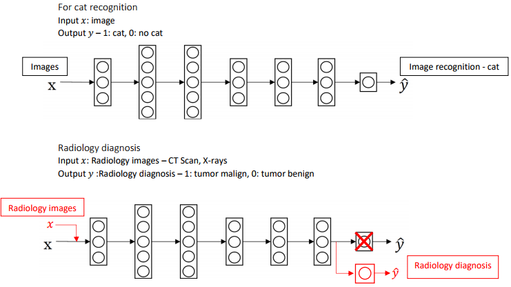 例如,我们将为猫识别器构建的神经网络迁移应用到放射科诊断中。因为猫识别器的神经网络已经学习到了有关图像的结构和性质等方面的知识,所以只要先删除神经网络中原有的输出层,加入新的输出层并随机初始化权重系数(,