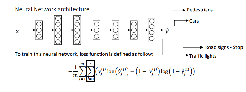 以汽车自动驾驶为例,需要实现的多任务是识别行人、车辆、交通标志和信号灯。如果在输入的图像中检测出车辆和交通标志,则输出的 y 为:
