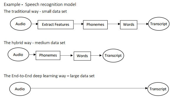 如果数据量较少,传统机器学习分块模型所构成的流水线效果会很不错。但如果训练样本足够大,并且训练出的神经网络模型足够复杂,那么端到端深度学习模型的性能会比传统机器学习分块模型更好。