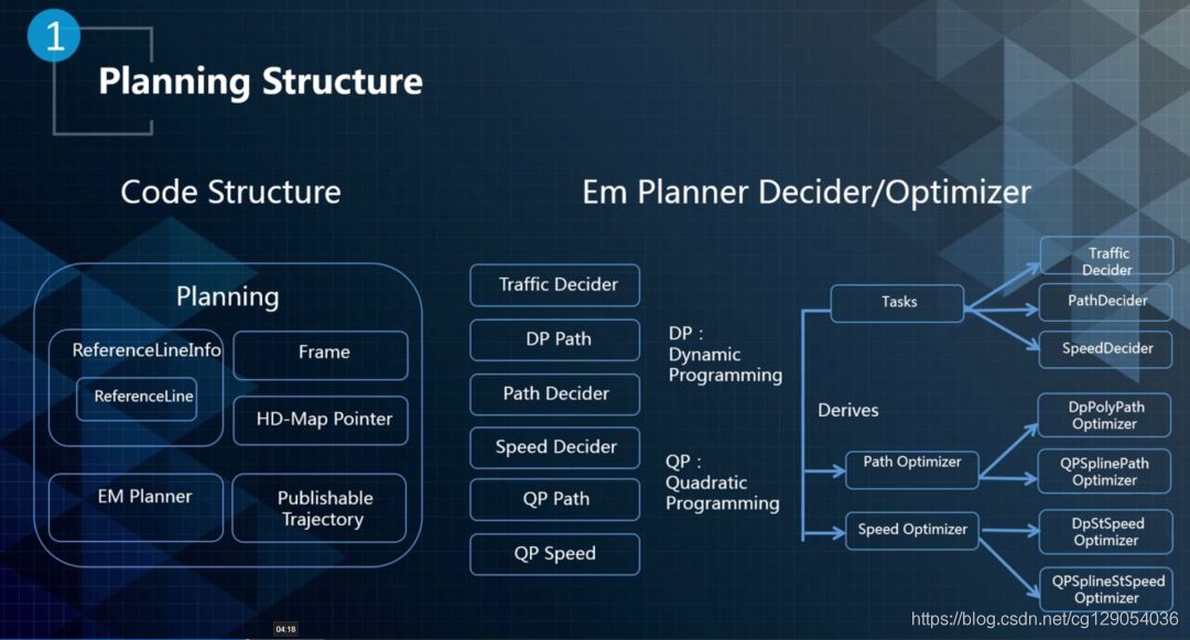 规划的目的是告诉车辆按一条什么样的路经行驶,其代码逻辑如图3所示。顶层左边部分是规划的容器。它有几个核心元素:参考线、高精地图、规划器Planner、轨迹发布。