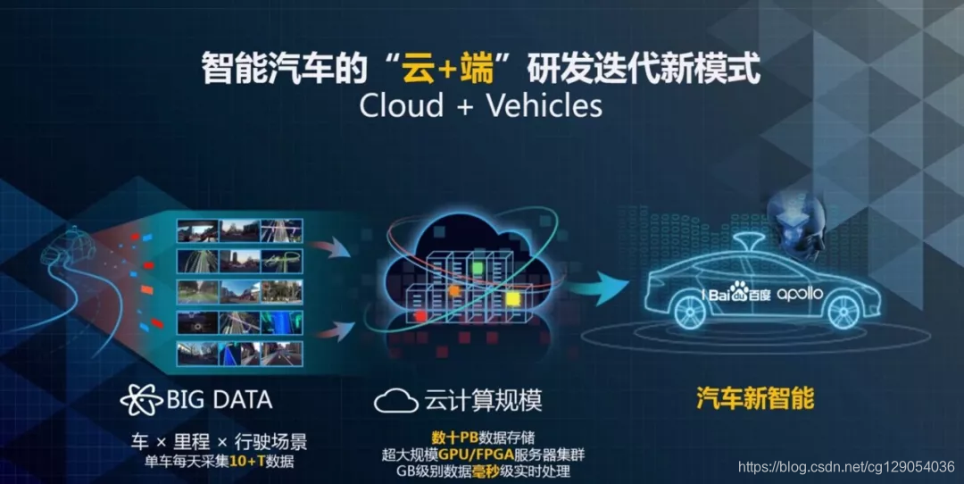 在根据教程搭建了具备感知和规划能力的平台之后,开发者更希望根据自己的场景进行深度定制。为加速研发过程,百度提出了“云+端”的研发迭代模式,所谓的“云”大家都能理解, “端”指的是车辆端,如图4所示。