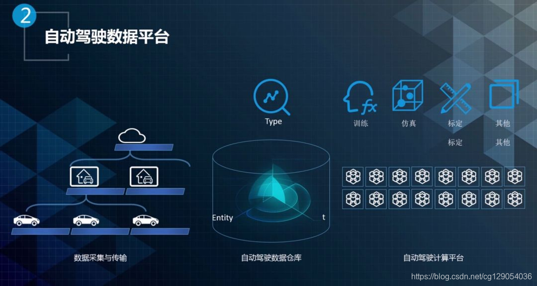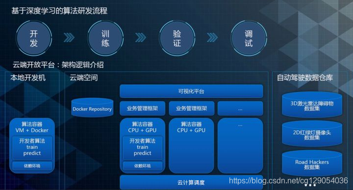 大概的流程是首先从车辆路测中积累海量的数据,将积累的数据传递到云端,然后利用云端服务器集群的强大计算能力去生成深度学习模型,并在云端做回归测试。最后将经过验证的模型更新到车辆上,赋予它新的迭代能力。