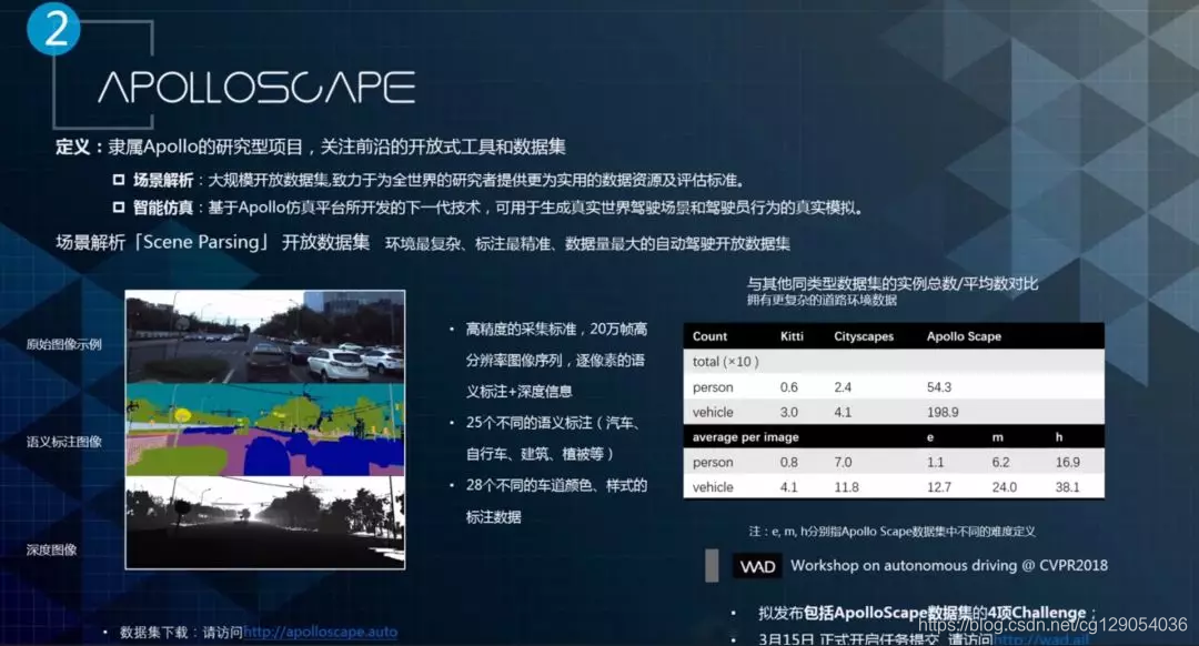 此外,Apollo还发布了一个叫Apollo Scape的学术性项目。Apollo Scape开放的数据在量级、复杂程度和精度方面都比业界有名的Kitty、citi scapes大一个数量级,目的是推动整个自动驾驶行业的发展,如图8所示。