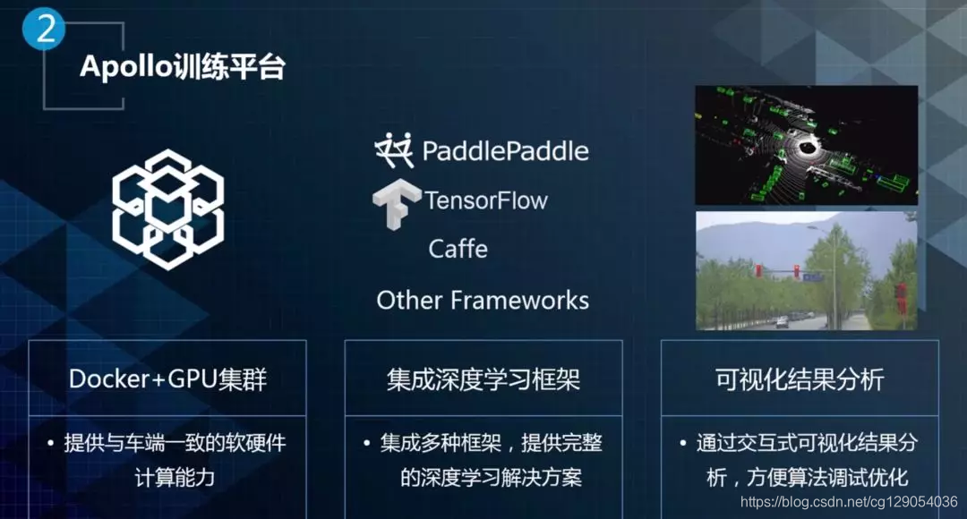 Apollo在云端提供了与车端一致的硬件计算能力,如图9所示。该计算平台基于Docker和GPU的集群构建,并且部署了PaddlePaddle、TensorFlow、 Caffe 等主流深度学习框架。此外,还有一个可视化展现平台,供大家了解结果。