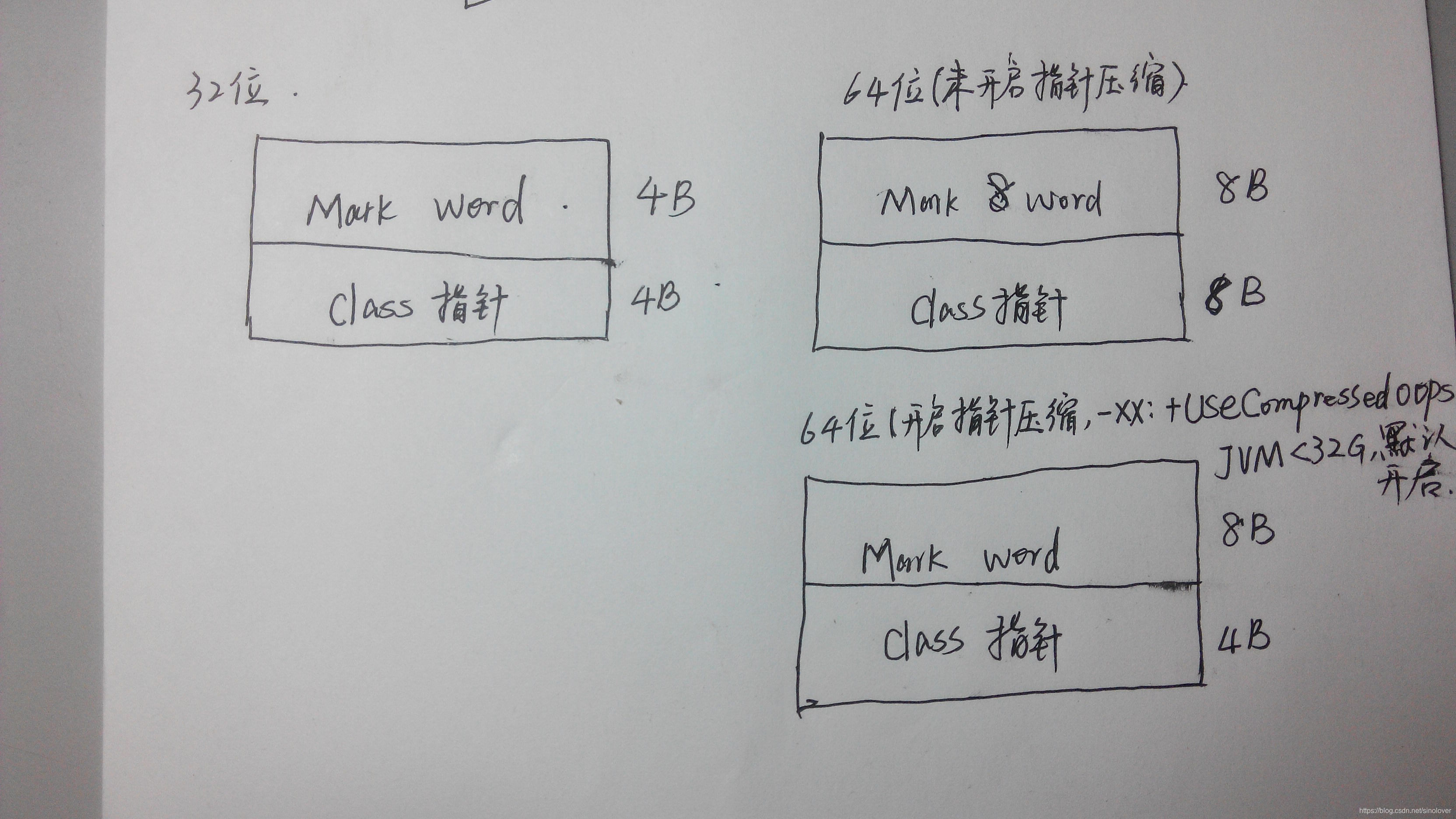 在64位系统中,Mark Work占4B,class指针在开启指针压缩的时候占4B;为开启指针压缩的时候占8B.