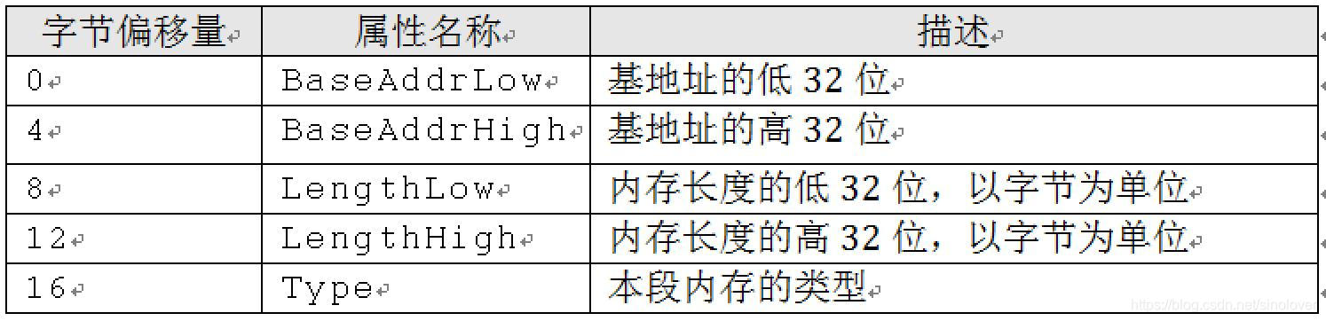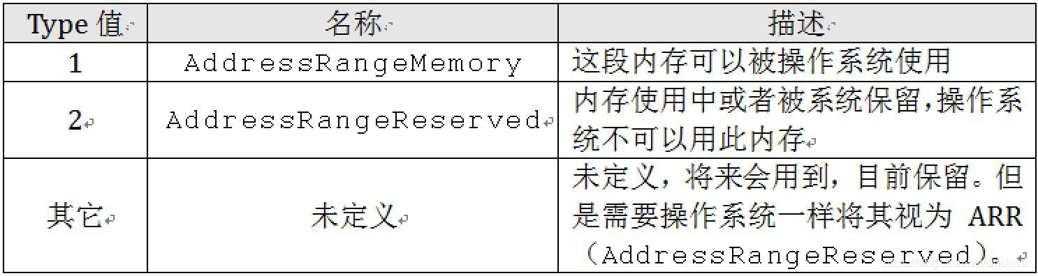 其中的Type字段是用来描述这段内存的类型,这里所谓的类型是说明这段内存的用途,是可以被操作系统使用,还是保留起来不能用。Type字段的具体意义见表