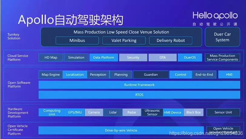 最上层的云服务层提供了高精地图服务、模拟仿真、Data Platform、安全和更新、DuerOS等。